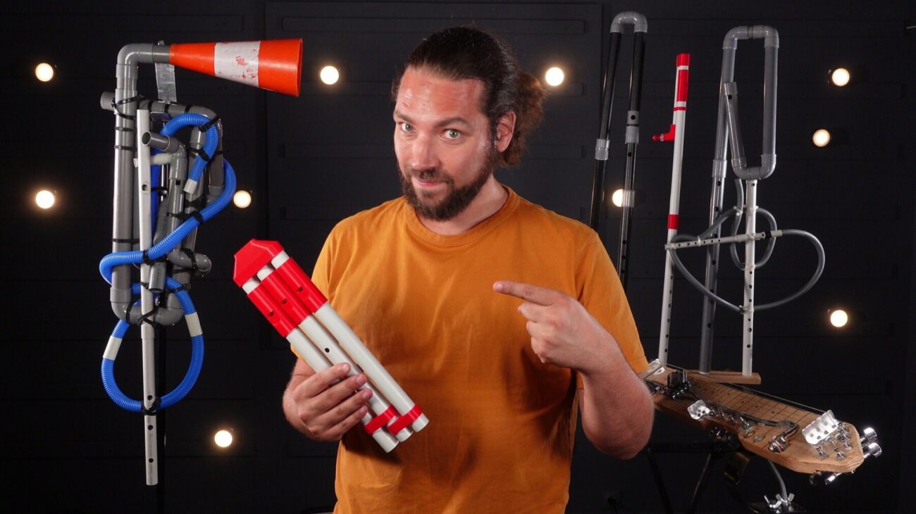 Il crée autour de ses instruments DIY, un folklore imaginaire et ouvre une fenêtre ludiquement pointue sur l’organologie et l’acoustique en donnant vie à des tuyaux en plastique et autres objets de récupération habilement détournés.